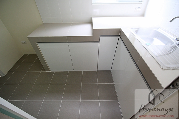 ตรงข้ามห้องน้ำจะเป็นห้องครัวแบบปิดนะคะ ประตูจะเป็นประตูบานเลื่อนกรอบอลูมิเนียมสีขาวแขวนรางเลื่อนด้านบน ลูกฟักกระจกเขียวตัดแสง และพื้นห้องครัวลดระดับลงจากห้องนั่งเล่นประมาณ 5 เซนติเมตร พื้นครัวปูกระเบื้องเซรามิกขนาด 30 x 30 cm.