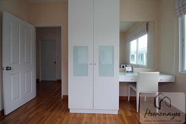 มองไปทางผนังฝั่งตรงข้ามเตียงทำตู้เสื้อผ้า Built in และโต๊ะเครื่องแป้งมาให้