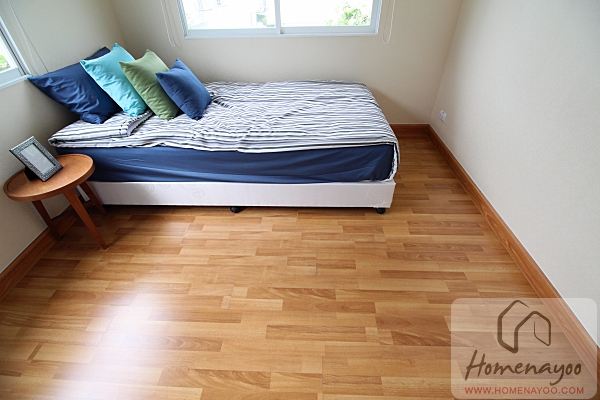 ลานจอดรถเป็นลานซีเมนต์เซาะร่องจอดในร่มได้ทั้ง 2 คัน, เฉลียงหน้าบ้านและลานหลังบ้านปูกระเบื้องเซรามิก 30 x 30 ซม.พื้นบ้านชั้นล่างปูกระเบื้องแกรนิตโต้ ขนาด 60×60 ซม. ส่วนพื้นบ้านชั้นบนปูพื้นไม้ลามิเนต 8 มม. สุขภัณฑ์ภายในห้องน้ำของ Cotto