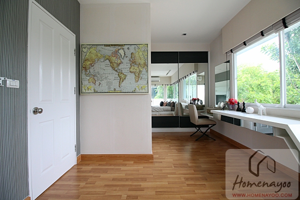 จากเตียงมองไปผนังอีกฝั่งวางตู้เสื้อผ้า Built in และโต๊ะเครื่องแป้งมาให้ดูระยะใช้งาน และเป็นทางเดินไปส่วนห้องน้ำในห้องนอนใหญ่