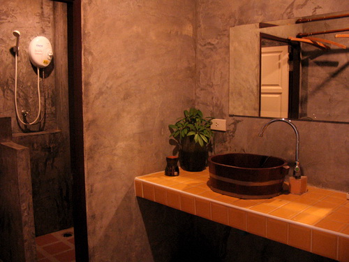 ที่ ธารีตารีสอร์ท อัมพวา ออกแบบภายในห้องพักได้อย่างน่าตะลึง บริเวณหน้าบ้านพักที่แบ่งไว้เป็นหลังเล็ก ๆ นี้ตกแต่งด้วยความดิบของผนังและพื้นปูนขัดมันชักเงา จัดวางเก้าอี้นั่งชมวิวสีไม้เข้มขรึมไว้ ใต้หน้าต่างกระจกสีสดใสแพรวพราว หากมองจากเพียงแค่ภายนอกเพียงแค่นี้จะเข้าใจว่าคงเป็นรีสอร์ทที่ตกแต่งแบบเท่ ๆ สไตล์ลอฟท์อย่างแน่นอน แต่นั่นเป็นเพียงภายนอกค่ะ