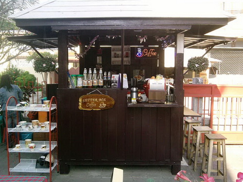 ความจริงหากมีพื้นที่เพียงเท่านี้ก็สามารถขายกาแฟแบบ take away ได้แล้ว แต่ในภาพจะเห็นได้ว่าพอมีพื้นที่เพิ่ม เจ้าของร้านจึงจัดวางโต๊ะเก้าอี้ไว้บริการลูกค้าที่ต้องการที่นั่งดื่มกาแฟได้อีกด้วยนะคะ ซุ้มกาแฟที่เห็นในภาพมีราคาไม่แพงเลย สามารถนำแบบไปจ้างช่างไม้มาสร้างและขนย้ายไปให้ก็ได้ค่ะ จะได้เริ่มต้นธุรกิจอย่างประหยัดและมีสไตล์ไงล่ะค่ะ
