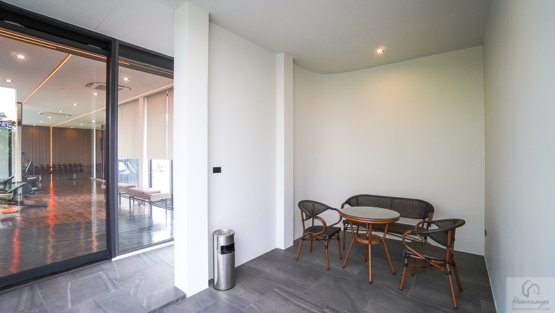 มุมพักผ่อนวางชุดโต๊ะนั่งไว้รองรับ ซ้ายมือเป็นห้องฟิตเนส