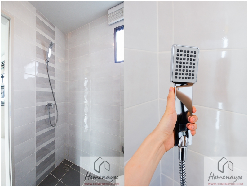 พื้นที่อาบน้ำจะไม่แยกส่วนแห้ง ส่วนเปียก มาให้ แต่ดูจากระยะการใช้งานแล้วพอที่จะติดม่านอาบน้ำได้ เพื่อไม่ให้ส่วนอื่นของห้องน้ำเปียกไปด้วย