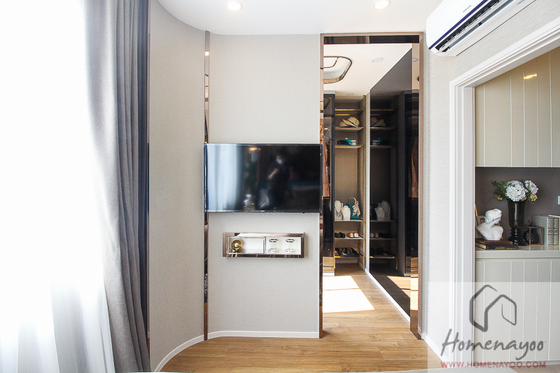 ส่วนพื้นที่ปลายเตียงทางโครงการมีการกั้นผนังครึ่งหนึ่ง แบ่งพื้นที่ส่วน Walk – in Closet ให้เป็นสัดส่วนแต่ถ้าใครกลัวว่ากั้นห้องแบบนี้แล้วห้องจะดูแคบ ก็สามารถที่จะใช้เป็นฉากกั้นแบบโปร่งหรือใช้ผนังกระจกฝ้าแทนก็จะช่วยทำให้ห้องดูกว้างขึ้นได้ค่ะ