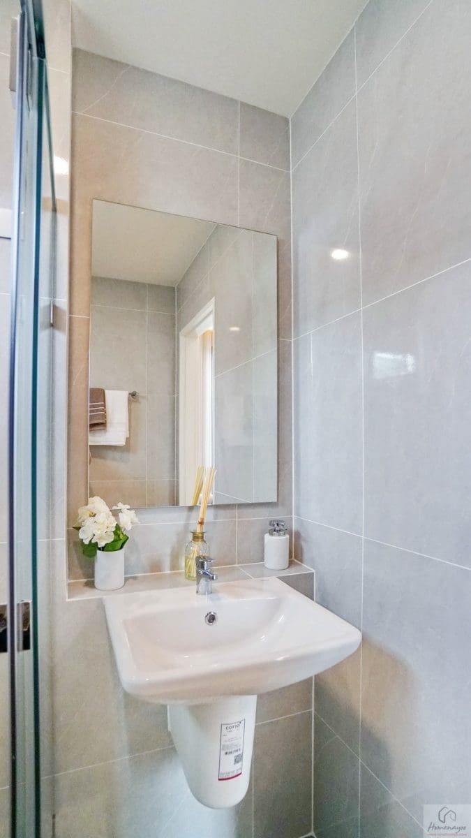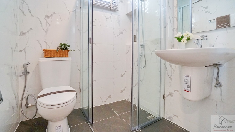 ใช้ฝักบัว Hand Shower คู่กับก๊อกน้ำโครเมียมก้านโยกแบบปัดขึ้น มีการเจาะผนังทำเป็นที่วางของใช้มาให้ พร้อมเดินงานระบบไฟฟ้าติด Junction Box รองรับการติดตั้งเครื่องทำน้ำอุ่นเรียบร้อย