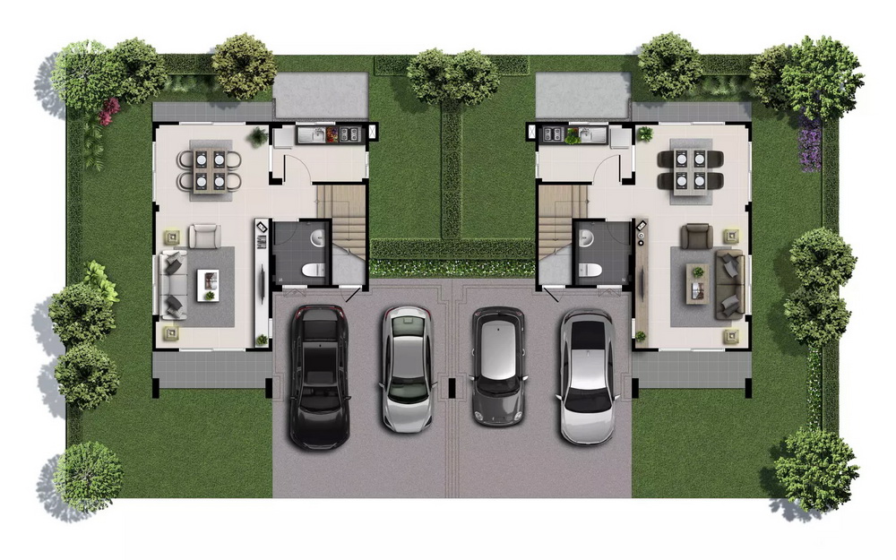 ซ้ายมือเป็นบ้านแฝด 2 ชั้น ที่ดิน เริ่มต้น 39.5 ตร.ว. พื้นที่ใช้สอย 126 ตร.ม. ขนาด 3 ห้องนอน 3 ห้องน้ำ 2 ที่จอดรถ