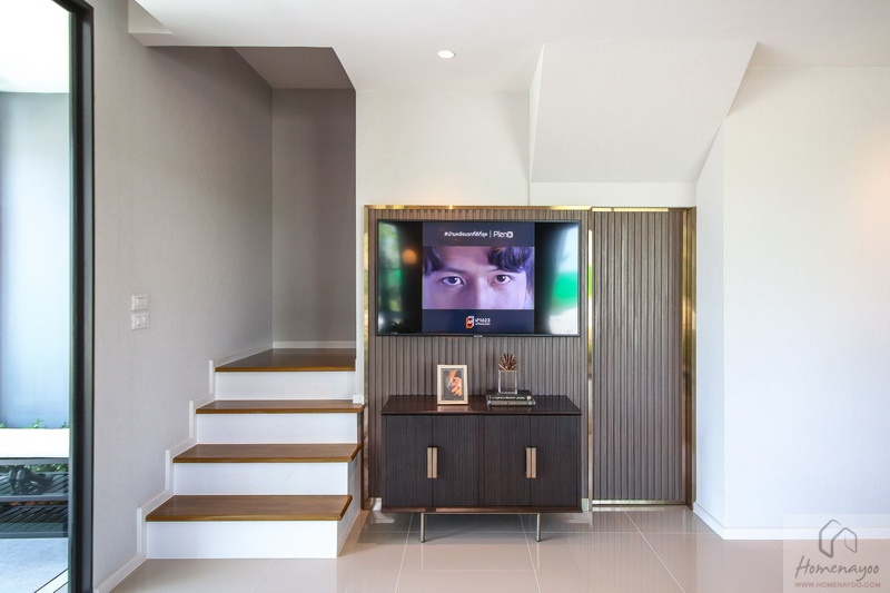 ตรงข้ามกับพื้นที่วางโซฟา เป็นพื้นที่สำหรับวางชั้นวางทีวี และห้องเก็บของใต้บันได บ้านตัวอย่างวางชั้นวางทีวี ความกว้าง 1.2 เมตร และ ติดทีวีแขวนผนังมาให้ดูเป็นไอเดีย ผนังด้านหลังเดินงานระบบไฟฟ้า และ เต้าเสียบปลั๊กไฟมาให้พร้อมต่อใช้งานค่ะ