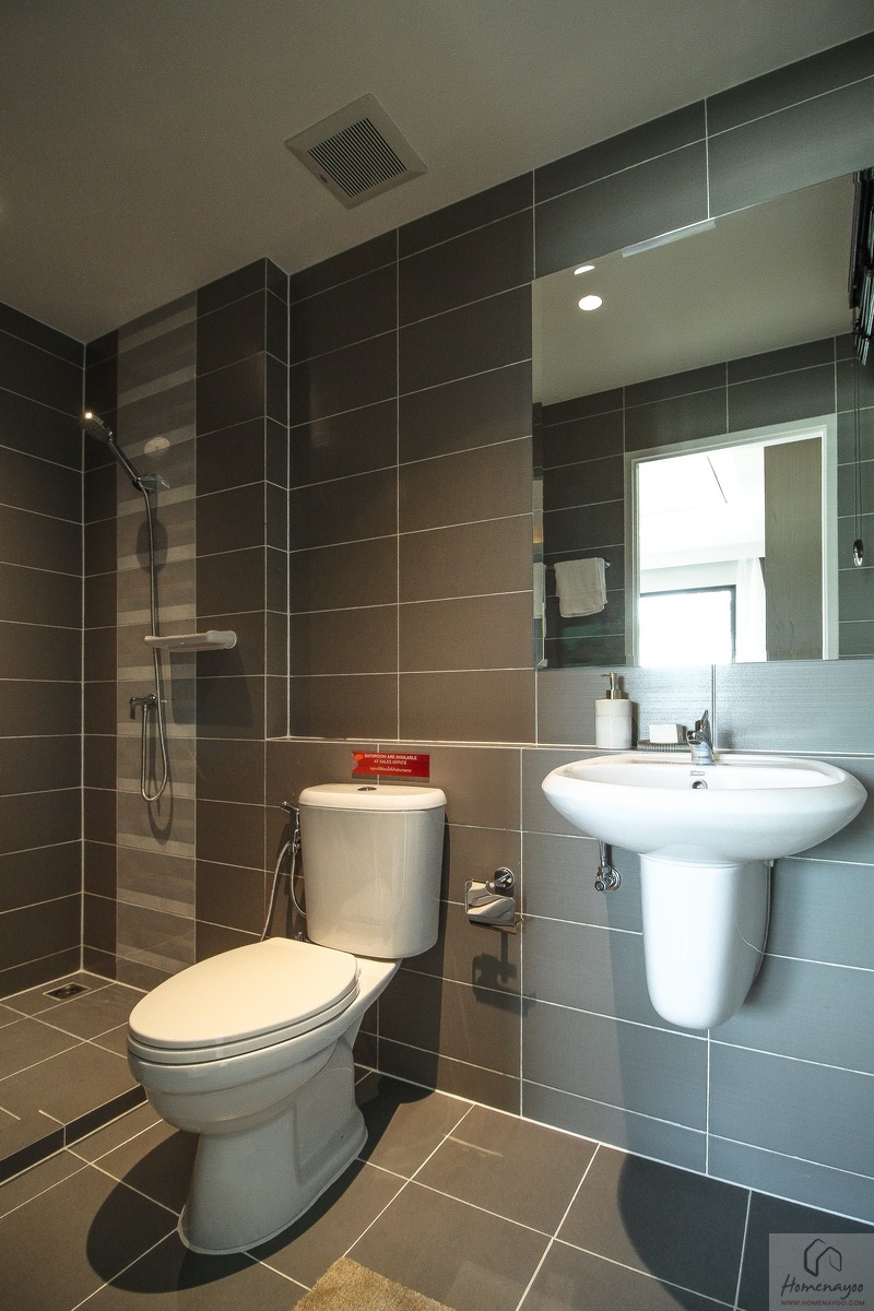 เข้ามาด้านในห้องน้ำ ได้ฟังก์ชันใช้งานครบถ้วน พื้นห้องน้ำปูกระเบื้องเซรามิกกันลื่นสีเทา 30 x 30 ซม. ผนังตกแต่งกระเบื้องเซรามิกสีเทา 2 เฉด 40x 20 ซม. คุมโทนเดียวกัน สุขภัณฑ์มาตรฐานของ American Standard หรือ เทียบเท่า ติดมาให้ตำแหน่งตามภาพ พร้อม Low-Wall, กระจกเงา และพัดลมระบายอากาศฝังฝ้าของ Mitsubishi 1 เครื่อง