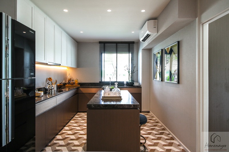 ในบ้านตัวอย่างต่อเติมเป็นห้องครัว โดยบิวท์อินเคาน์เตอร์ครัว L-Shape และ วาง Island สำหรับเตรียมอาหารมาให้ดูระยะใช้งาน