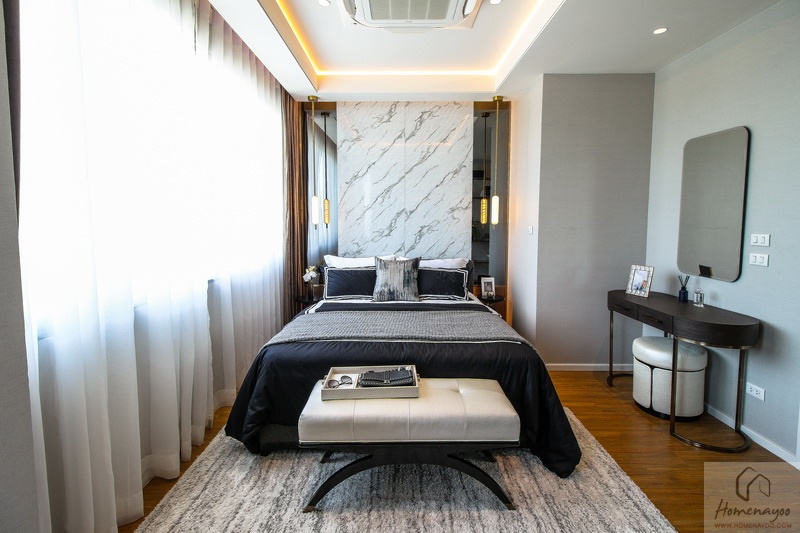 จุดเด่นของ Master Bedroom คือจะมีช่องแสงฝั่งหน้าบ้านที่ได้เป็นบานใหญ่ออกแบบมาเฉพาะให้เข้ากับโครงการ ทำให้เปิดรับแสง รับลมธรรมชาติ และวิวฝั่งหน้าบ้านได้อย่างเต็มที่
