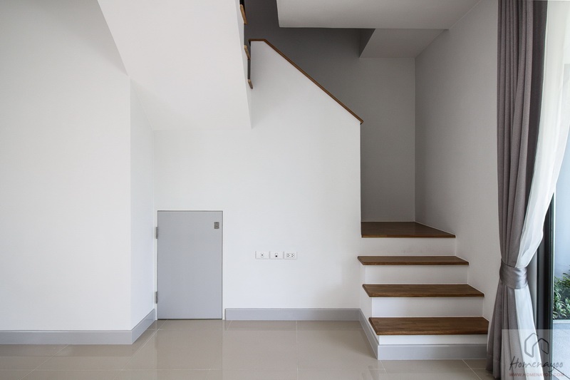 โถงบันไดทางขึ้นบ้านจะอยู่ติดกับประตูทางเข้าบ้าน โครงสร้างบันไดเป็นโครงเหล็กสำเร็จรูป ลูกตั้งเป็นไม้ทาสีขาว ส่วนลูกนอนเป็นไม้สำเร็จรูปสีธรรมชาติ