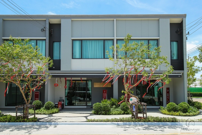 ด้านหน้าสำนักงานขาย บ้านตัวอย่าง ที่มีทั้งแบบตกแต่งให้ดูเป็นไอเดีย และ แบบบ้านเปล่า ที่ลูกค้าจะได้รับจริง