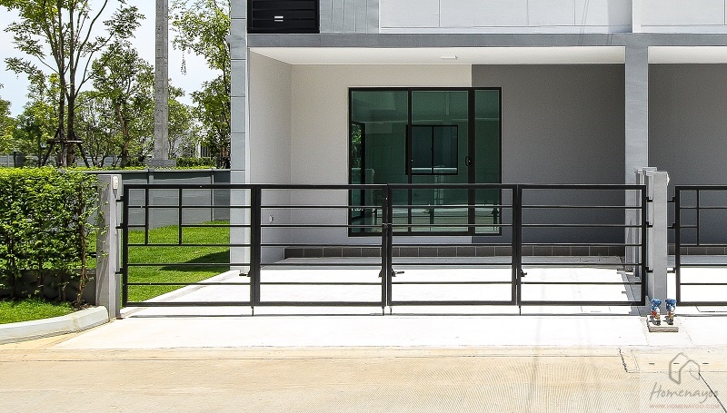 บ้านมาตรฐานติดตั้งประตูรั้วเหล็กโปร่ง แบบบานพับ 2 ตอน เปิดได้จนสุด ความสูง ประมาณ 1.2 เมตร กำแพงบ้านแบบคอนกรีตเสริมเหล็กทาสีเทา ความสูง ประมาณ 1.5 เมตร พร้อมติดตั้งกริ่งไร้สายที่หน้าบ้านให้ครบทุกยูนิตค่ะ