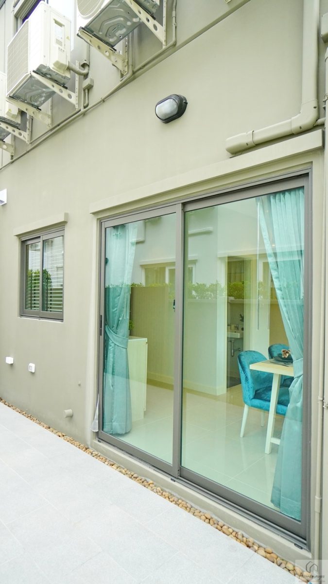ทางออกไปลานซักล้างหลังบ้านจะได้ประตูกระจกบานเลื่อน กรอบ UPVC สีขาว ติดมาให้คู่กัน 2 บาน ใช้เปิดเชื่อมหลังบ้าน และใช้รับแสงธรรมชาติในตอนกลางวันได้ดี