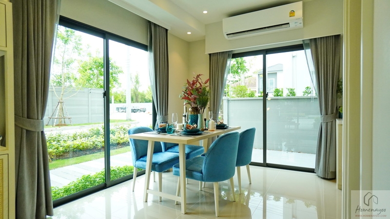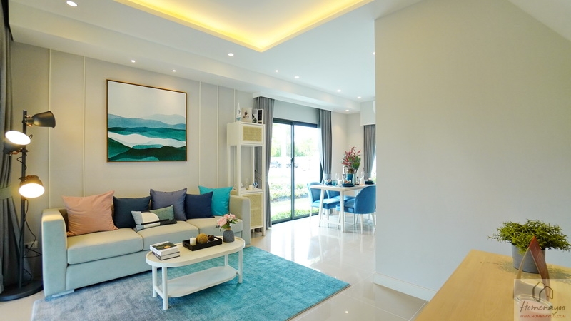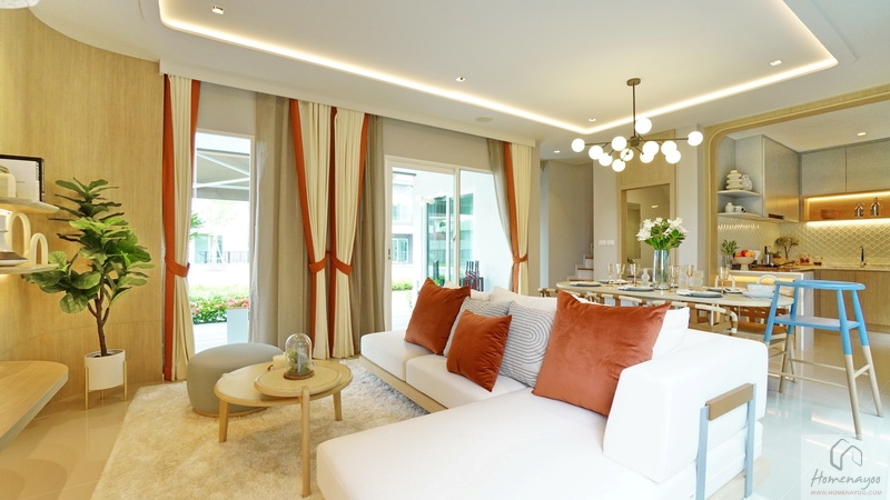 เข้ามาภายในบ้านจะเจอกับ Living & Dining Area แบบ Open Plan ที่โปร่ง โล่ง กว้าง จัดวางมุมพักผ่อนด้วยโซฟา ขนาด 2-4 ที่นั่ง และชั้นวางทีวีตัวยาวได้ ด้านหลังจัดเป็นมุมทานอาหาร รองรับโต๊ะทานข้าวขนาด 6 ที่นั่งได้สบาย ๆ ต่อเนื่องไปที่ด้านหลังจะเป็นห้องครัวปิดขนาดใหญ่ มีประตูเชื่อมต่อกับลานซักล้างหลังบ้านได้อีกที