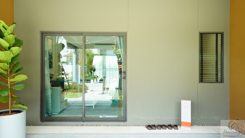 ส่วนประตูทางเข้าหลัก, ประตูหลังบ้าน และหน้าต่างที่เป็นทั้งตัวบานเลื่อนและบานฟิกซ์ ฝั่งของบ้านแฝดจะใช้ลูกฟักกระจกเขียวตัดแสงเหมือนกับทาวน์โฮม แต่เปลี่ยนบานกรอบมาเป็น UPVC สีขาว ที่มีความยืดหยุ่นสูง เก็บเสียงภายนอก-ภายในได้ดี, ไม่มีรอยต่อทำให้ไม่รั่วซึม ที่สำคัญไม่บวมน้ำไม่ลามไฟ ปลอดจากการกัดแทะปลวก มอด แมลง
