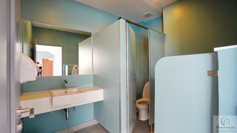 ห้องน้ำเป็นห้องตอนลึก แบ่งส่วนแห้ง แยกส่วนเปียกมาให้ ได้กระเบื้องพื้นและผนังคุมโทนสีเทา, สีขาว และตกแต่งกระเบื้องลายไม้มาให้ในส่วนเปียก (ไม่รวมฉากกั้นอาบน้ำ) สุขภัณฑ์มาตรฐาน Spec เดียวกันทั้งโครงการ โดยจะใช้เป็นของ Cotto หรือเทียบเท่า ติดตั้งมาให้ตำแหน่งตามภาพ และมีตัวช่วยในการระบายอากาศเป็นพัดลมฝังเพดาน 1 ตัว
