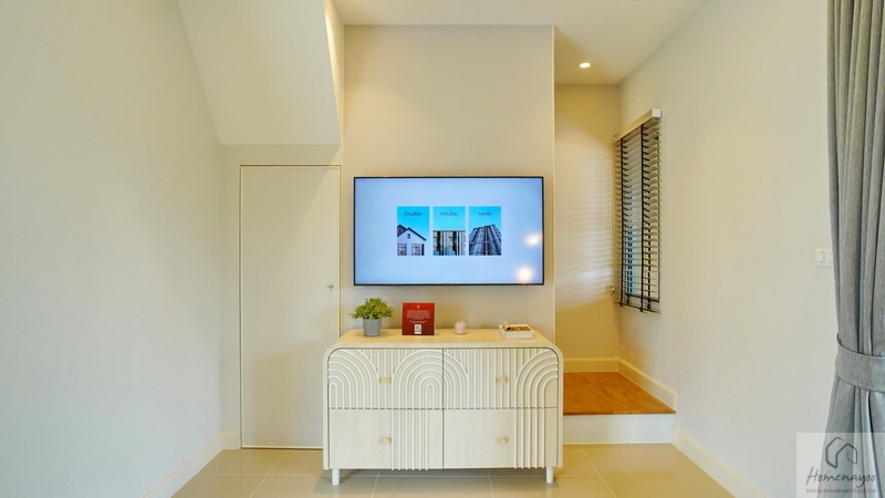 ภายในปูพื้นกระเบื้องแกรนิตโต้สีเบจ 60 x 60 ซม. ต่อเนื่องมาจากด้านนอกเช่นเดียวกัน ในบ้านตัวอย่างตกแต่งเป็น Guest Area ไว้สำหรับรองรับลูกค้า ส่วนบ้านจริงเราสามารถทำเป็นห้องนอนผู้สูงอายุ, ห้องเด็กเล็ก, ห้องทำงาน, ห้องทำการบ้านของลูก ๆ หรือใครที่ขายของ Online สามารถใช้เป็น Studio Live ขายของ หรือห้อง Packing สินค้าได้เลย
