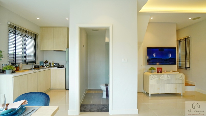 จากมุมทานอาหารจะเชื่อมต่อไปยังห้องครัวส่วนตัวในบ้าน และห้องน้ำชั้นล่างได้สะดวก
