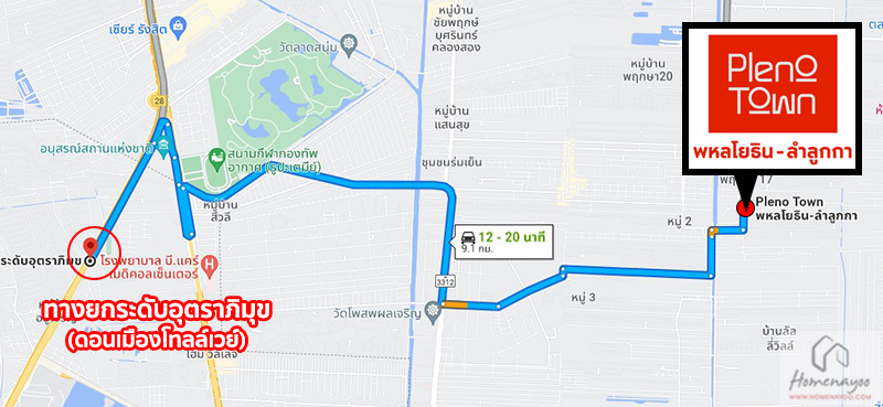 การเดินทางเริ่มจาก ถนนพหลโยธิน ⇒ แยกคปอ. ⇒ กลับรถ แยกซอยพหลโยธิน 54/4 ⇒ ซอยพหลโยธิน 54/2 (ประตูกรุงเทพพลาซ่า) ⇒ ถนนลำลูกกา (BTS คูคต) ⇒ ถนนเลียบคลองสาม (ถนนชลมาร์คพิจารณ์) ⇒ Pleno Town พหลโยธิน-ลำลูกกา