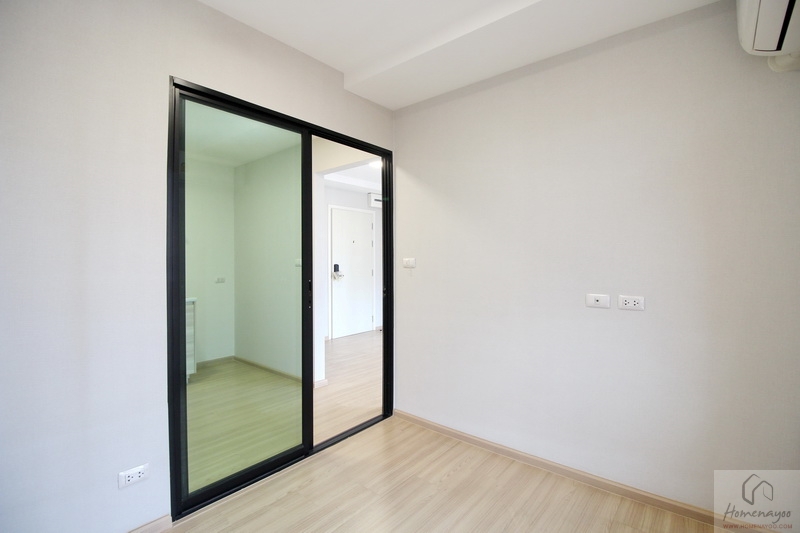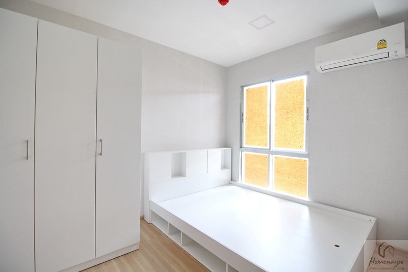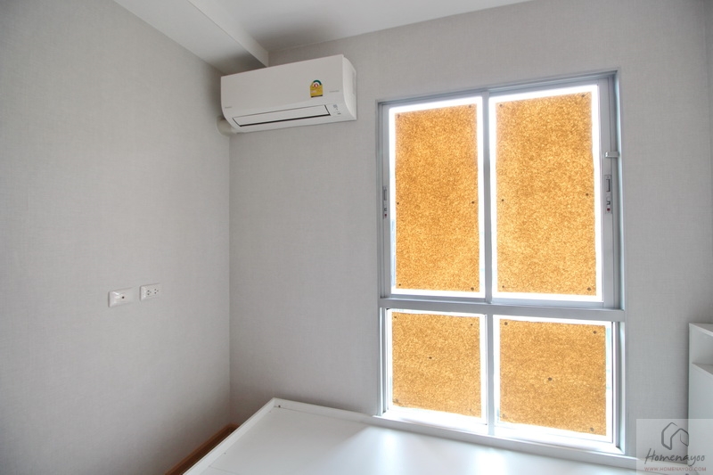 ถัดจากห้องน้ำมาจะเป็นที่ตั้งของห้องนอน ได้ประตูไม้บานทึบ ลูกบิดกลมกดล็อก ภายในห้องมีพื้นที่ขนาดพอเหมาะ สามารถวางเตียงเดี่ยว 3.5-5 ฟุต และเสริมด้วยเฟอร์นิเจอร์มาตรฐานได้อีก 1-3 ชิ้น ภายในห้องนี้จะได้หน้าต่างกระจกบานผสมมา 1 ชุด โดยจะมีทั้งแบบบานเลื่อน และบานฟิกซ์ มีการติดแอร์ Wall Type ของ Daikin รุ่น Inverter มาให้ด้วยค่ะ