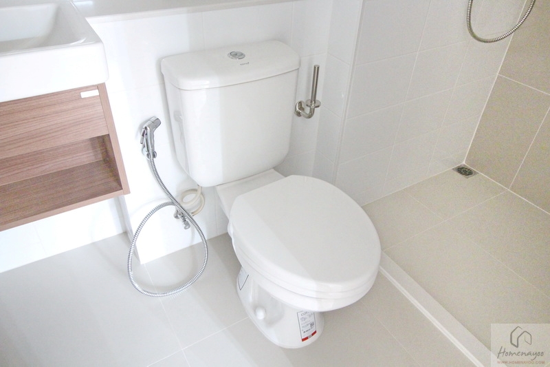 ส่วนอาบน้ำอยู่ด้านในสุด ระยะใช้งานสบาย ๆ ได้ฝักบัว Hand Shower ก๊อกน้ำโคเมียมก้านโยก และที่วางสบู่ฝังกำแพง 1 ชิ้น พร้อมเดินงานระบบติด Junction Box รองรับการต่อเครื่องทำน้ำอุ่นให้ครบ