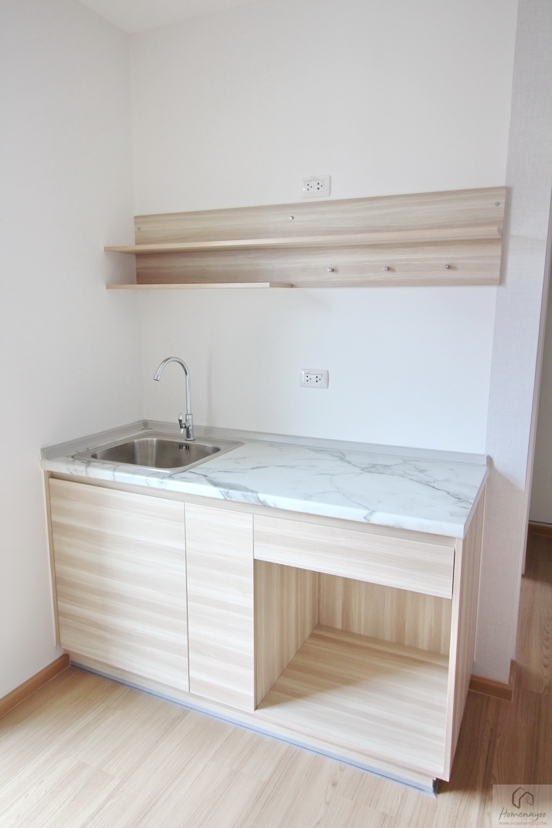 หน้าท็อปลามิเนตลายหินอ่อน พร้อมซิงค์ล้างจาน ชั้นวางของ ตู้เก็บของด้านล่าง และช่องวางไมโครเวฟ ข้างชุดครัวสามารถวางตู้เย็น ขนาด 6-8 คิว ได้ จุดนั้นจะมีเต้าเสียบปลั๊กไฟติดมาให้ครบแล้วค่ะ