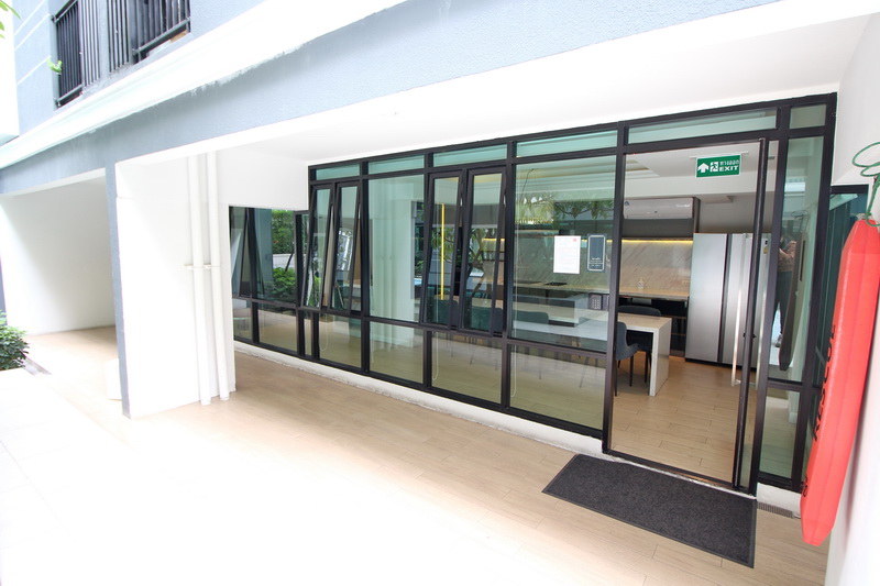 ทางเข้าห้องอเนกประสงค์ได้เป็นประตูกระจกเขียวตัดแสง แบบบานเลื่อน กรอบอะลูมิเนียมสีดำ