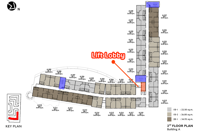 แปลนชั้น 2-8 อาคาร A มีห้องพักอาศัยทั้งหมด 238 ยูนิต แบ่งชั้นละ 34 ยูนิตต่อชั้น ห้องมีให้เลือก 3 ขนาด แบบ 1 Bed 22.5 ตร.ม. จะมีชั้นละ 15 ยูนิต แบบ 1 Bed 26 ตร.ม. มีชั้นละ 13 ยูนิต และแบบ 1 Bed Plus 34.95 ตร.ม. มีชั้นละ 6 ยูนิต