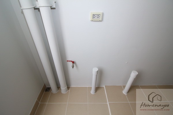 พื้นที่สำหรับวางเครื่องซักผ้า เดินงานระบบประปาให้พร้อม + ผนังติดเต้าเสียบปลั๊กไฟแบบกันน้ำ