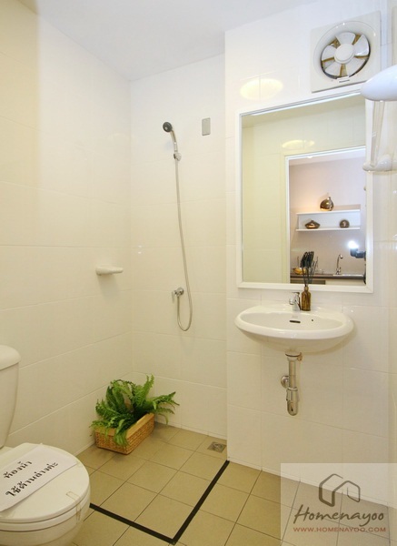 ห้องน้ำแบ่งฟังก์ชั่นส่วนแห้ง และส่วนอาบน้ำให้ ห้องจริงจะไม่มีฉากกั้นอาบน้ำให้นะคะ พื้นห้องน้ำปูกระเบื้องเซรามิค 20 x 20 ซม. ผนังกรุกระเบื้องเงา สุขภัณฑ์ภายในห้องน้ำทั้งหมดของ American Standard ค่ะ