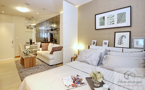 เปิดประตูเข้ามา จะเจอกับมุมพักผ่อนเป็นส่วนแรก มองต่อเนื่องไปเป็นห้องนอน แบบเปิดโล่ง ไม่มีฉากกั้นห้องให้ พื้นห้องชุดปูไม้ลามิเนตหนา 8 มม. ความสูงพื้น-เพดาน 2.45 เมตร ผนังห้องติดวอลเปเปอร์สีพื้น ฝ้าเพดานฉาบเรียบ ไฟภายในห้องแบบโคมซาลาเปาทั้งหมดค่ะ