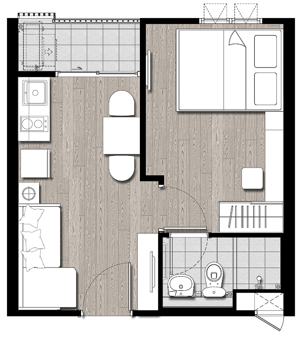 อีกห้องที่เราจะพาชมไปชม จะเป็นห้องพักแบบ 1 ห้องนอน ขนาด 26.5 ตร.ม. ฟังก์ชั่นเดียวกันกับห้องตัวอย่างด้านบนทุกประการ แต่ห้องนี้จะมีการจัดวางเฟอร์นิเจอร์มาในรูปแบบของ Package Fully Furnished By Chic Republic ตกแต่งครบ พร้อมเข้าอยู่ ได้เฟอร์นิเจอร์บิวท์อินลอยตัวครบชุด (ยกเว้นเครื่องใช้ไฟฟ้า และ ผ้าม่าน)