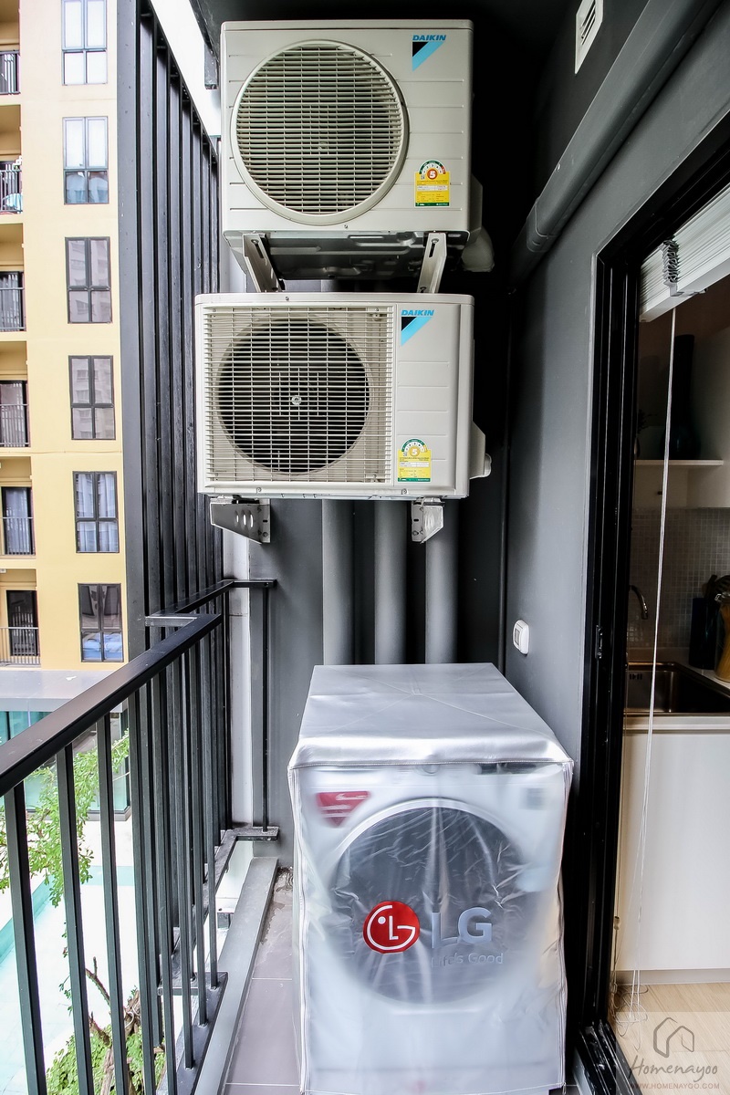 ถัดออกไปเป็นระเบียงซักล้าง ห้องมาตรฐานติดแอร์ Wall Type ของ Daikin ขนาด 9,000 BTU มาให้เรียบร้อย