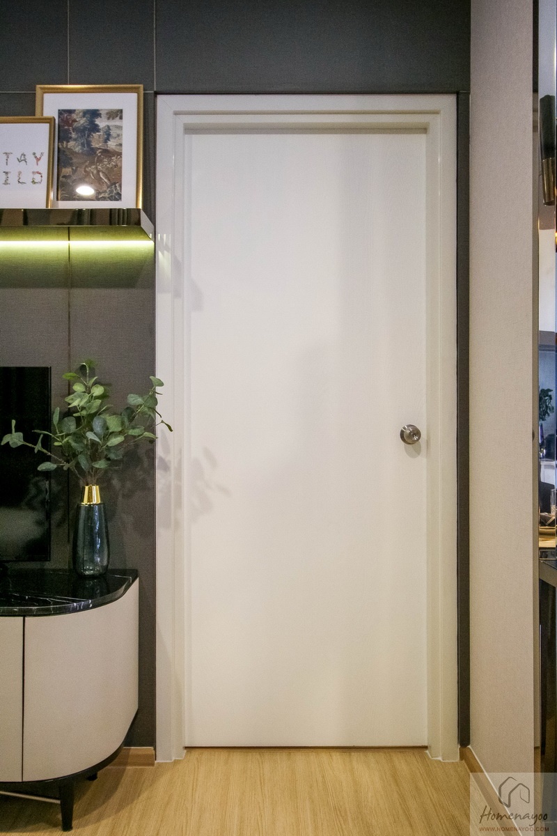 ห้องนอนมีประตูไม้สีขาว ลูกบิดกลมกดล็อกปิดมิดชิดเช่นเดียวกัน