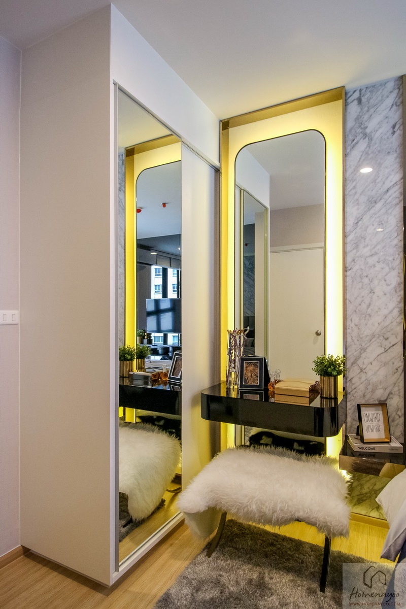 ข้างเตียงวางโต๊ะเครื่องแป้ง และ โต๊ะหัวเตียงได้อย่างลงตัว ส่วนตู้เสื้อผ้าเป็นแบบบานเปิด หน้าบานกระจกเงา บิวท์อินมาให้เรียบร้อยค่ะ