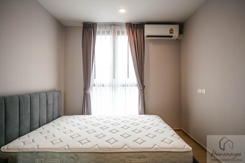 บรรยากาศภายในห้องนอน ลูกค้าจะได้เฟอร์นิเจอร์ครบชุดตามภาพ ทั้งฐานเตียงนอน 5 ฟุต, โต๊ะเครื่องแป้ง, โต๊ะหัวเตียง, ตู้เสื้อผ้า และ แอร์ Wall Type ของ Daikin ขนาด 9,000 BTU สิ่งที่ไม่ได้จะเป็นที่นอน และ ผ้าม่านเท่านั้น*