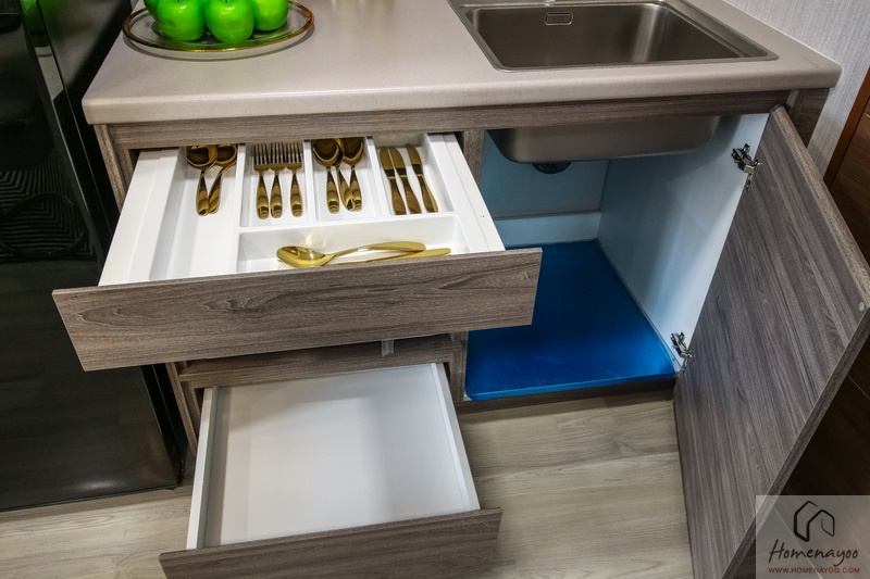 ด้านล้างมีตู้เก็บของบานเปิด และ ลิ้นชักเก็บของ พร้อมภาดเก็บช้อนส้อม และ ที่วางไมโครเวฟขนาดมาตรฐานให้แบบนี้