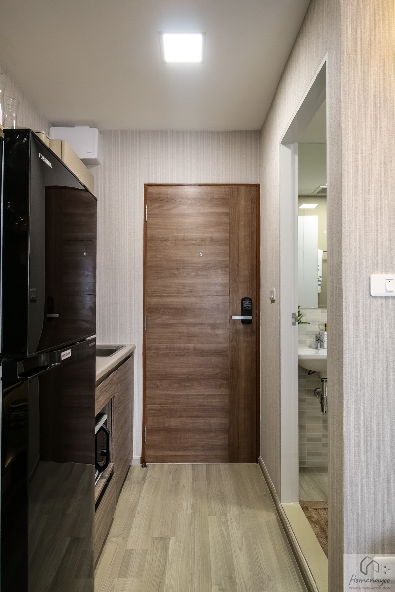 เปิดประตูห้องพักเข้ามาจะเจอกับมุมครัว และ ห้องน้ำเป็นส่วนแรก มองต่อเนื่องไปเป็นมุมนั่งเล่น และ ห้องนอน พื้นห้องปูไม้ลามิเนตหนา 8 มม. ความสูงพื้น-เพดาน 2.5 เมตร ผนังห้อง และ ฝ้าเพดานฉาบเรียบทาสี ไฟภายในห้องแบบดาวน์ไลท์ LED ทั้งหมดค่ะ