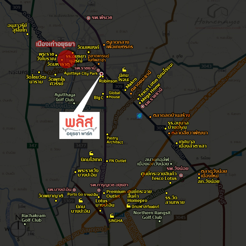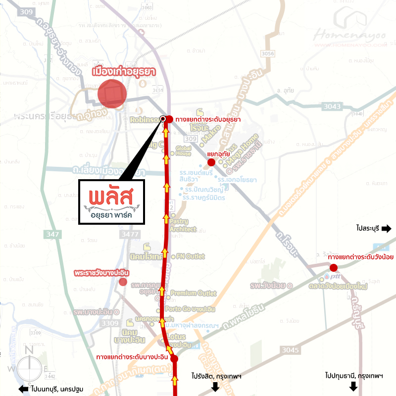 การเดินทางเริ่มจาก ถ.พหลโยธิน ⇒ ทางแยกต่างระดับบางปะอิน ⇒ ทางหลวงแผ่นดินหมายเลข 32 ถ.สายเอเชีย ⇒ ถึงโครงการ พลัส คอนโด อยุธยา พาร์ค *ติด Lotus อยุธยา