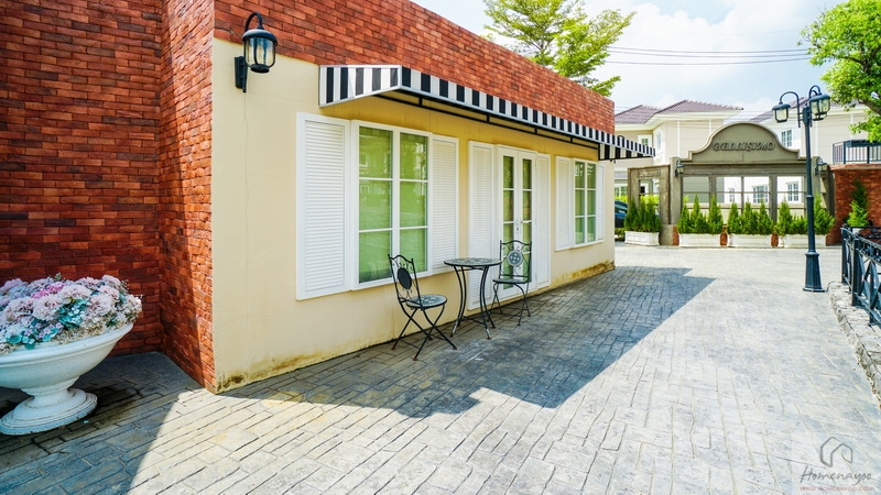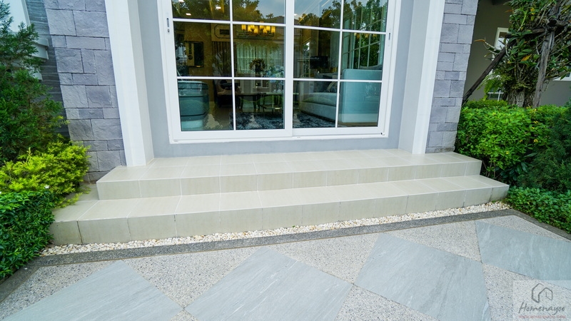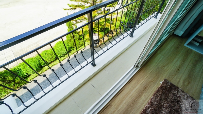 พื้นมีการยกสูงขึ้นมาเล็กน้อยเพื่อป้องกันฝุ่น, ความชื้น และสิ่งสกปรกต่าง ๆ พัดเข้าสู่ด้านในห้อง ปูพื้นระเบียงด้วยกระเบื้องเซรามิกสีเทาอ่อน พื้นที่ใช้งานค่อนข้างจำกัด แต่สามารถเปิดสูดอากาศรับลมภายนอกหรือเปิดระบายอากาศภายในห้องได้ พร้อมติดราวกันตกเป็นโครงเหล็กทาสีดำพร้อมราวจับมาให้เรียบร้อย