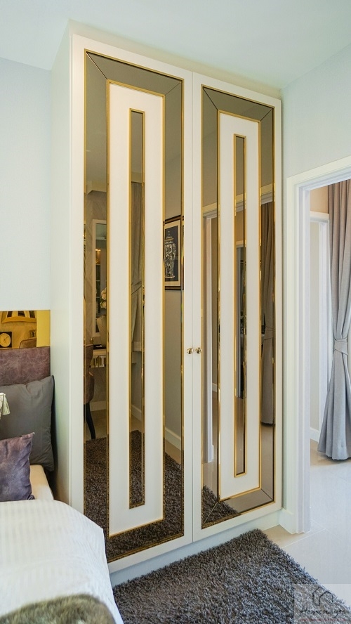 โดยเป็นตู้เสื้อผ้าบานเลื่อนทรงสูงจรดเพดาน ใช้โทนสีเทาเข้ากับเฟอร์นิเจอร์ต่าง ๆ ภายในห้อง