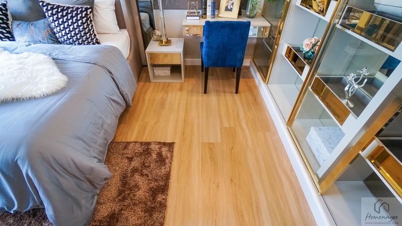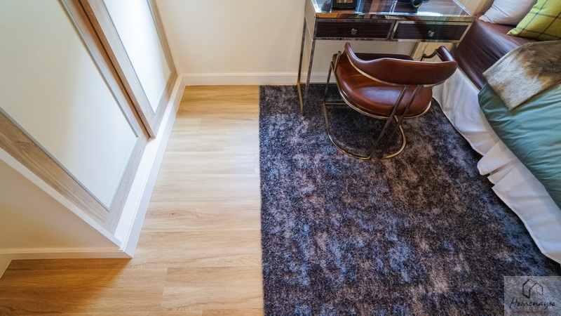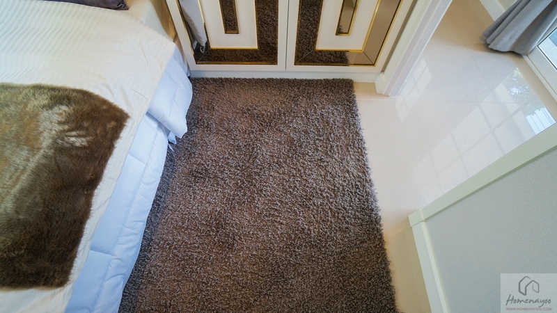 พื้นที่ข้างเตียงกว้างขวาง ใช้เดินเข้า-ออกหรือยืนแต่งตัวได้อย่างสบาย ๆ ที่พื้นติดกับเตียงนอนวางเป็นพรมสวย ๆ เข้ากับบรรยากาศภายในห้อง