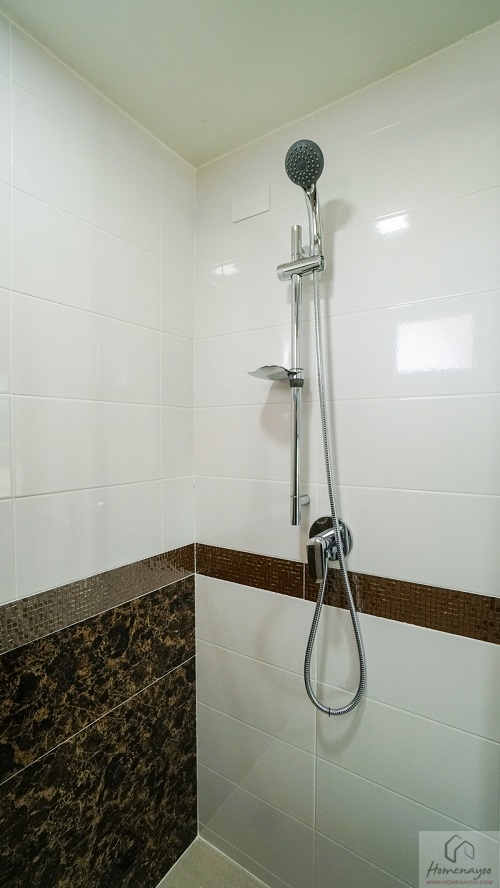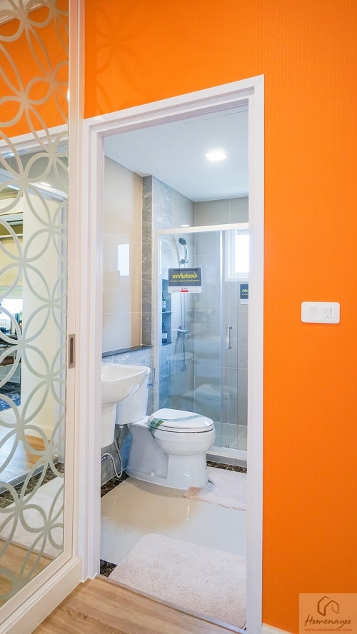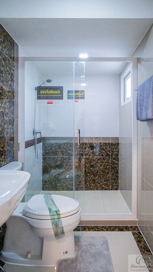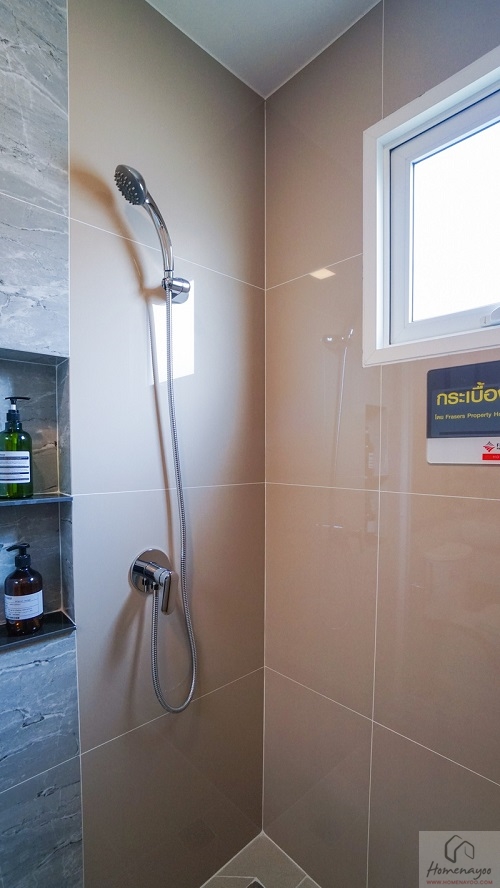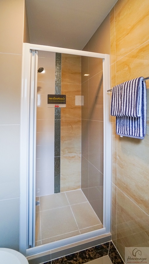 ด้านในสุดจะเป็นมุมอาบน้ำที่ทางโครงการได้ติดตั้ง Shower Box มาให้เรียบร้อย มีหน้าต่างระบายอากาศบานกระทุ้งกระจกฝ้าให้ 1 บาน ด้านหน้าติดตั้งราวแขวนผ้าขนหนูมาให้อีก 1 ชิ้น