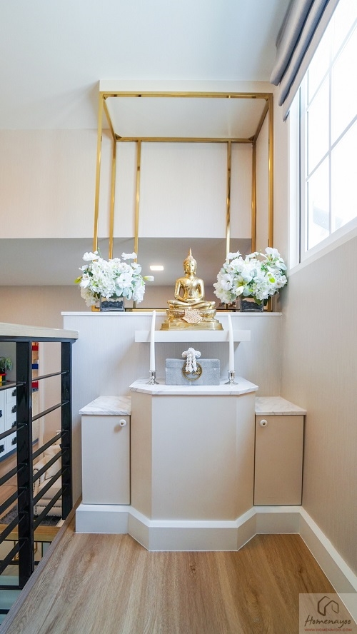 ถัดเข้าไปบ้านตัวอย่าง Built-in เป็นโต๊ะหมู่บูชาโทนสีขาว