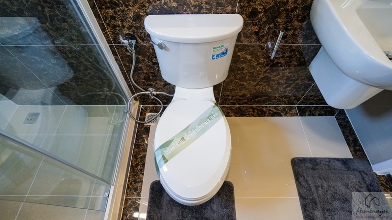 ถัดมาเป็นโถสุขภัณฑ์ 2 Piece ระบบ Single Flush จาก Kohler พร้อมติดตั้งสายฉีดชำระและที่แขวนกระดาษทิชชูสแตนเลสมาให้แบบครบเซ็ต ระยะการนั่งใช้งานสะดวกสบาย