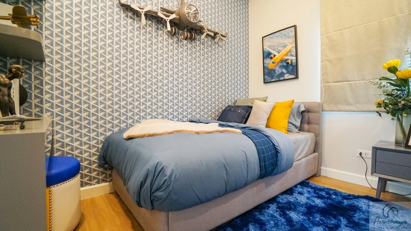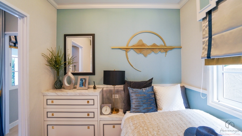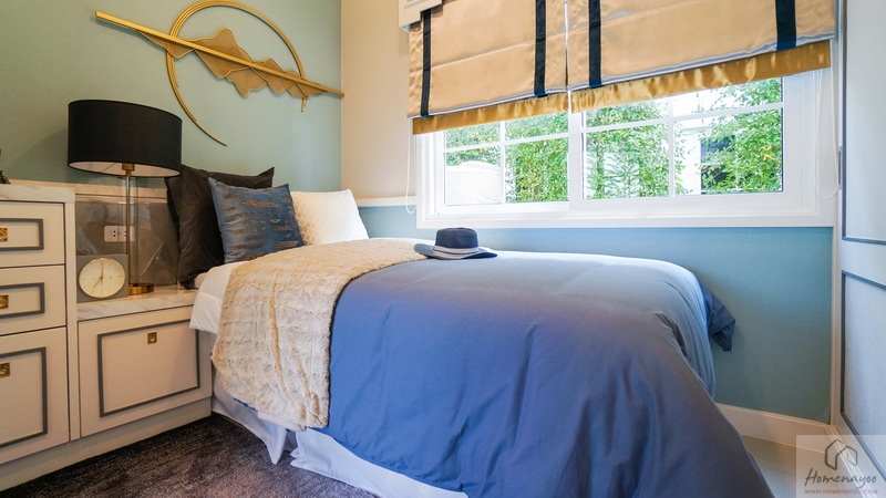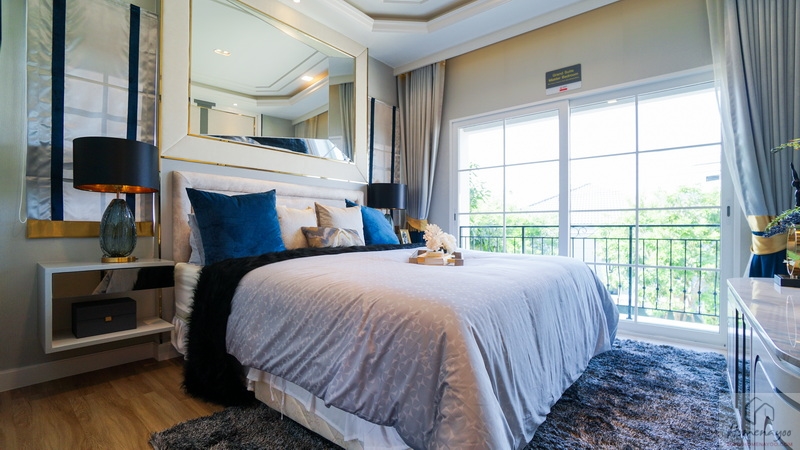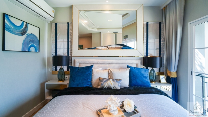 ฝั่งหัวเตียงกรุเป็นผนังสีน้ำเงินสวยงาม ด้านข้างวางเป็นโต๊ะข้างหัวเตียงขนาดใหญ่ 1 ฝั่งให้ดูระยะใช้งาน