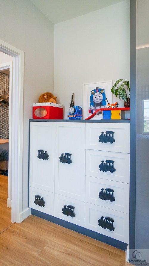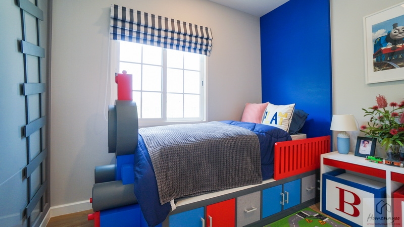 ส่วนฝั่งปลายเตียงกรุเป็นผนังโทนสีเทาพร้อมทำเป็นรางรถไฟแบบ 3 มิติ และมีหน้าต่างบานใหญ่ให้อีก 1 จุด