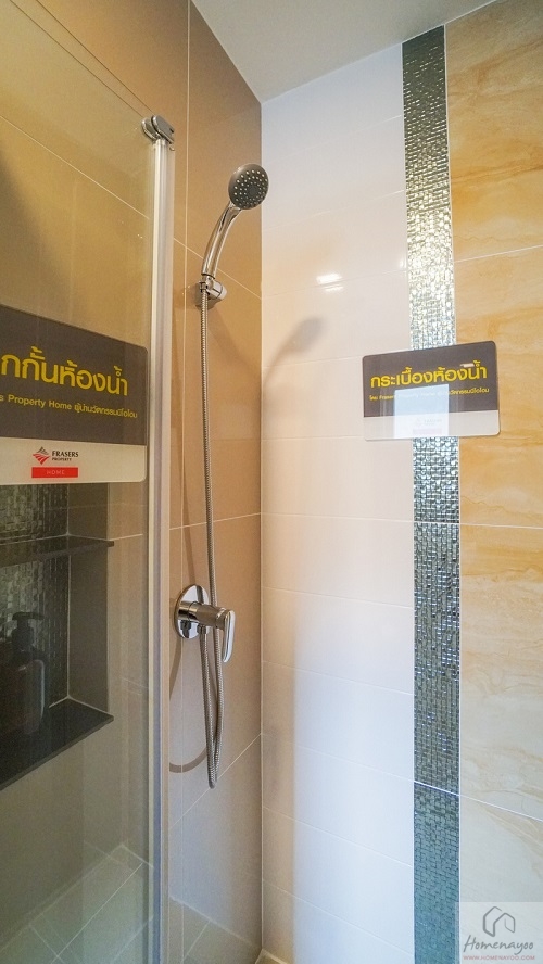 ติดกันด้านในจะเป็นมุมอาบน้ำที่ทางโครงการได้ติดตั้ง Shower Box มาให้เรียบร้อย พื้นที่ใช้งานกว้างขวางกำลังดี มีหน้าต่างระบายอากาศบานกระทุ้งกระจกฝ้าให้ 1 บาน